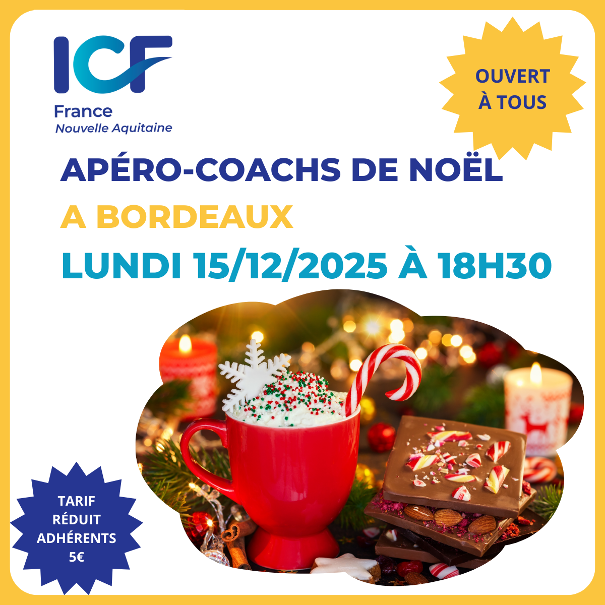 Rejoignez-nous Ă Bordeaux pour un ApĂ©ro-Coachs spĂ©cial NoĂ«l : un moment de rencontres, dâĂ©changes et de rires, avec au programme⊠des surprises, des cadeaux et la chaleur dâun rĂ©seau qui fait du bien.