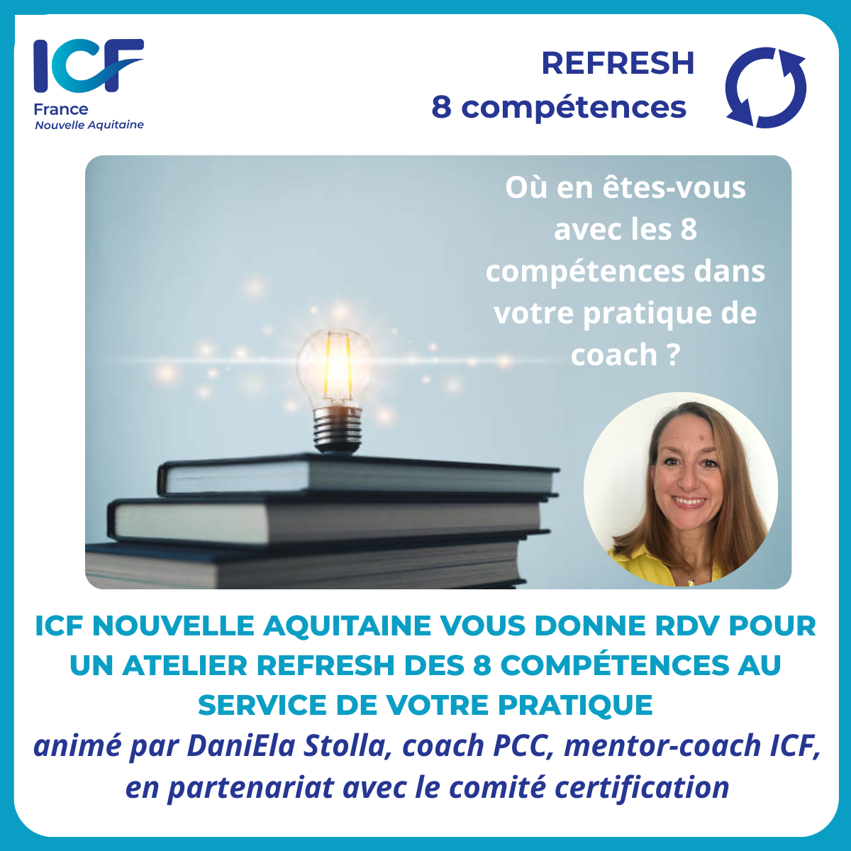 DaniEla Stolla, co-présidente de l’antenne Nouvelle Aquitaine, coach PCC et mentor-coach ICF vous propose un atelier REFRESH pour intégrer l’intention des 8 compétences et augmenter votre pratique.