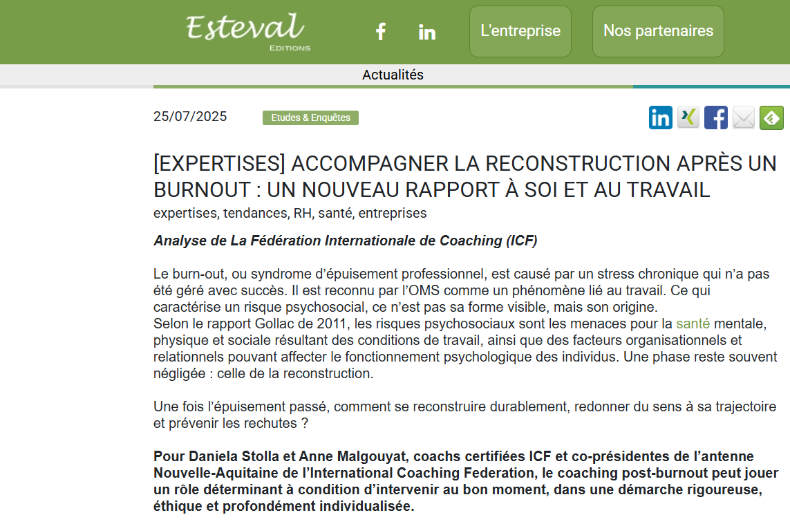 Pour Daniela Stolla et Anne Malgouyat, coachs certifiées ICF et co-présidentes de l’antenne Nouvelle-Aquitaine de l’International Coaching Federation, le coaching post-burnout peut jouer un rôle déterminant à condition d’intervenir au bon moment, dans une démarche rigoureuse, éthique et profondément...